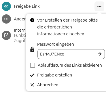 In Datensafe ist es nicht möglich eine Linkfreigabe ohne Passwort zu erstellen. Es ist daher bereits an zufälliges sicheres Passwort vorausgefüllt.