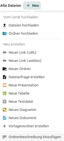 Zunächst sehen Sie all Ihre angelegten Ordner oder Dateien. Auch Ordner und Dateien, die Ihnen von Anderen freigegeben wurden, finden Sie hier. Über die Plus-Schaltfläche können Sie Dateien von Ihrem Computer hochladen, sowie neue Ordner oder diverse Arten von Dateien erstellen. Mehr zu den Office-Dateien erfahren Sie in der allgemeine Dokumentation Office in Wolke.
