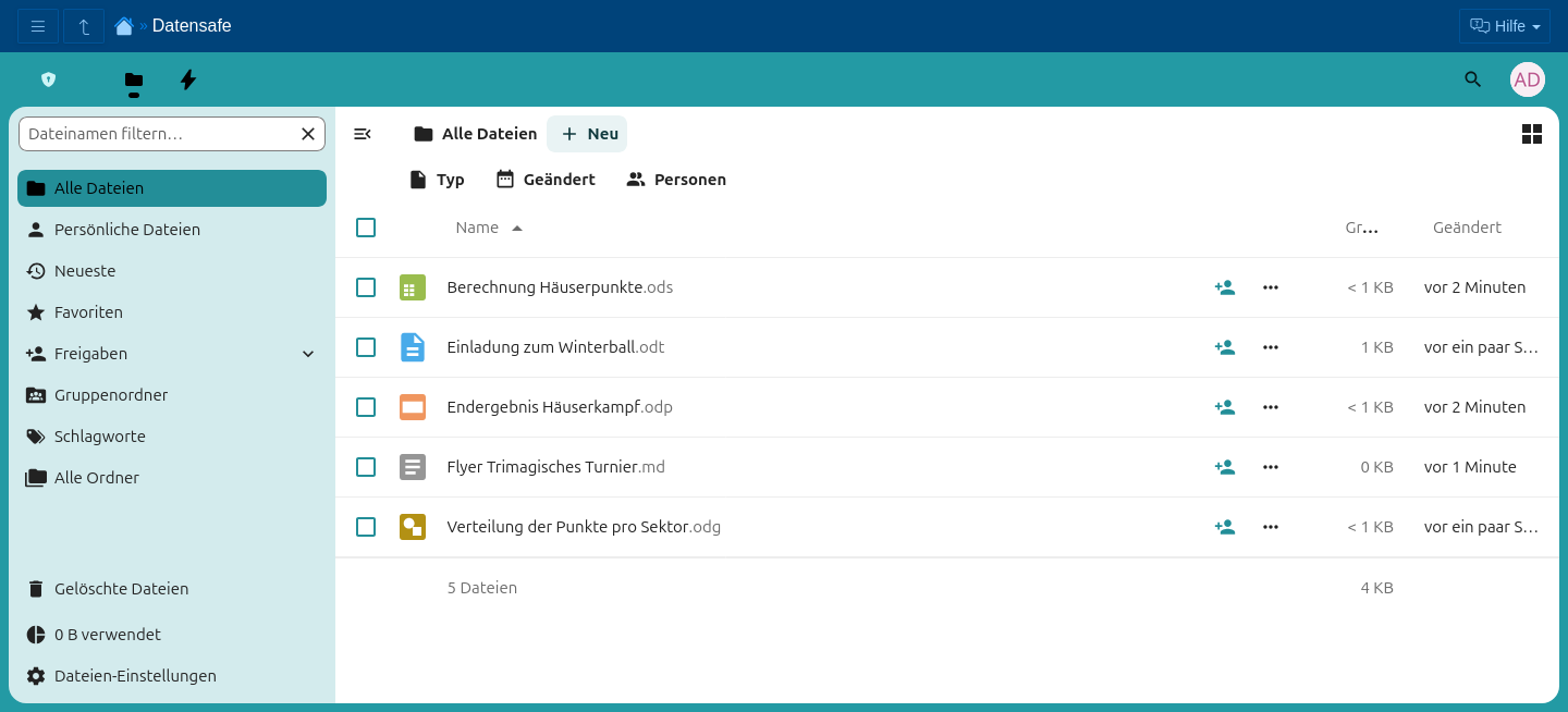Datensafe ist eine Erweiterung des Moduls Wolke und bietet daher die meisten Funktionen, die auch in Wolke verfügbar sind. Dieser Abschnitt behandelt ausschließlich Funktionen, die speziell für Datensafe gelten. Allgemeine Themen zur Dateiablage Wolke werden entweder in Hamburg: Wolke oder in der allgemeinen Dokumentation von Wolke beschrieben.